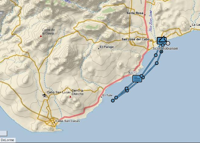 Wednesday afternoon after battening everything down we headed out and around Land's End. We had one reef in the main and a partial jib rolled out. In the distance we could see a definite line between normal white capping wind waves and a full herd of raging buffalo. Across the distance these buffalo roared south, a never ending field of white frothy boulders. A mile out we felt the full brunt of that northerly rushing down the outside of the Baja peninsula. Seas to 8 feet, spaced seconds apart! Wind gusting to 20 knots! Wow, we should have double reefed and had the smaller staysail deployed. Should we do this amidst this frothing, leaping, crazy herd of buffalo or just tuck back in behind Land's End where the seas are calm and the tourists are zooming around on jet skis and lounging on party boats? We chose to head back and once there in the calm of the late afternoon our thoughts turned to cold drinks, a nice dinner, and the wisdom of waiting for the calmer seas and lighter winds of tomorrow for a more civilized departure. A few hours later we were in a cantina in Cabo San Lucas with a Mexican band serenading us and Scott and Connie dancing like Latin lovers.